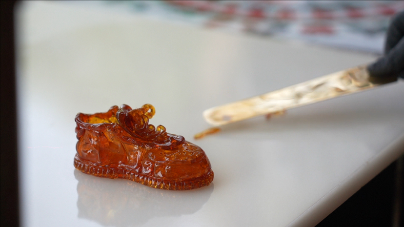 采访中,一只糖画做的新颖精美的鞋子吸引了记者的目光。吴毅介绍,由于鞋子是立体的,制作步骤非常繁琐,要将整体分成鞋底、鞋体和鞋面三部分。这种立体糖画不仅考验画功和拼凑手艺,还对糖的温度有要求,“熬糖的火候得掌握好,要用小火慢熬,糖太软,不利于塑型,糖太焦,吃起来苦涩。”一番精雕细琢之后,吴毅将做好的立体鞋子糖画展示在案板上,只见鞋带、鞋孔等细节清晰可见,十分逼真,如同3D打印出来的效果。