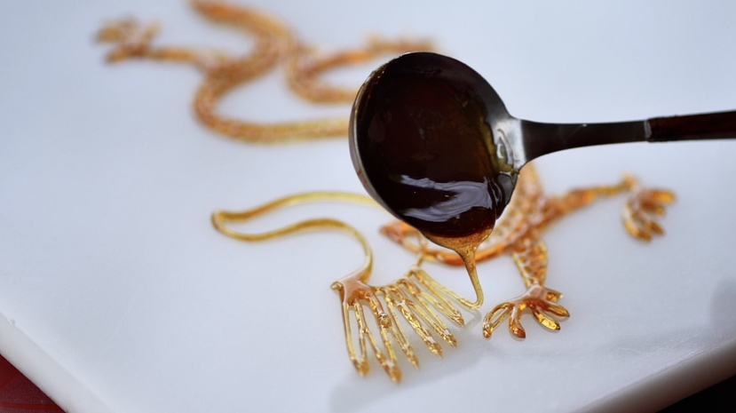 接着,他再次用铁勺取出适量的糖料,铺在大理石板上,待糖料凝固前,要迅速勾勒出龙的轮廓,并运用铲子等工具,细心地压制出特殊花纹。“糖画龙的制作过程比较繁琐,先画出龙的五官、四肢,再与身体进行组装,最后将龙头拼接上去,每一个部分都需要严格把关,但只要有好的基本功,做起来都游刃有余。”不一会儿,吴逢全一点一点地给龙添上鳞片,画上眼睛,连一根根的龙须都清晰可见,完全是一个甜蜜的“艺术品”。