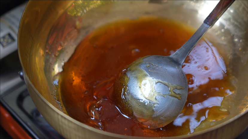 吴逢全从九岁开始跟着老一辈学习糖画,至今已有四十余年。他始终认为,拥有扎实的基本功是能够做好糖画的前提,其中,“倒糖饼儿”便是众多种类的基本功之一。“熬化的糖要倒出一个圆很容易,难点在最后提丝的时候,必须把握好时间和力气,断丝也有讲究,要干脆利落,不着痕迹。”一边说着,吴逢全一边将熬好的硬糖在锅中融化,用一柄小铜勺舀出,麻利地制作了数个小糖饼,随后,腕转肘移间,一只小巧逼真的龙爪跃然案板之上。