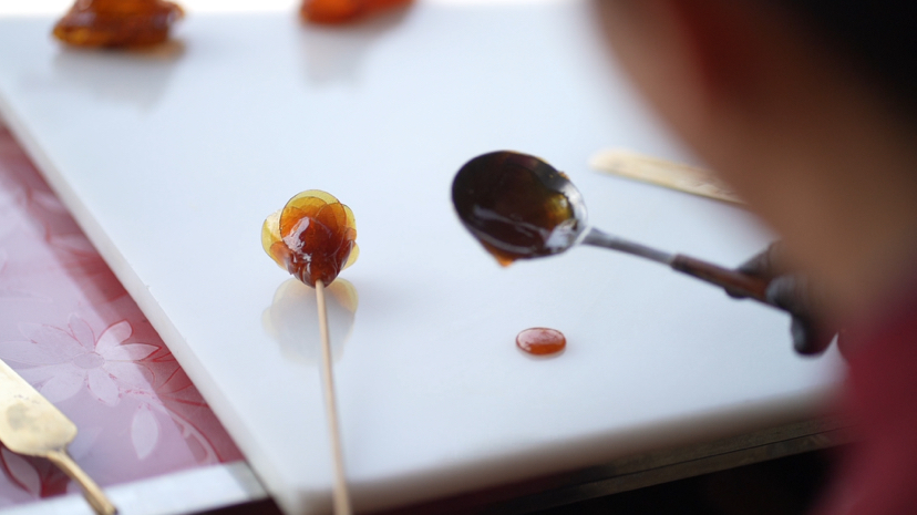 一提起糖画,便能唤醒四川人甜蜜的童年记忆。小时候,成堆的孩童喜欢围着街边的糖画小摊打转,那一勺勺融化的糖汁在手艺人手中,三五下就变成了造型生动多样的糖画,如同一场神奇的魔术表演。而拿到糖画的“幸运儿”,则总是小心翼翼地稳稳捏着、目不转睛盯着,生怕破坏了精美的图案。最后,只见那“幸运儿”在众人的目光下忍不住轻轻咬下一点,刹那间,甜滋滋的味道在舌尖、心尖弥漫开来。
