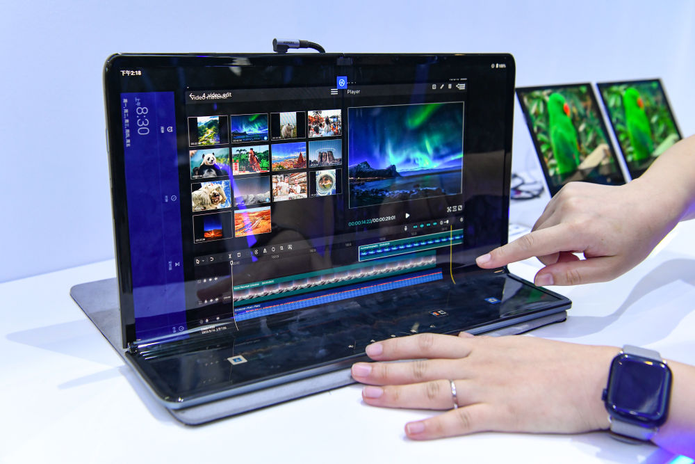 在“2023世界显示产业大会新型显示创新成果展”现场,工作人员展示京东方折叠显示屏。新华社记者唐文豪 摄