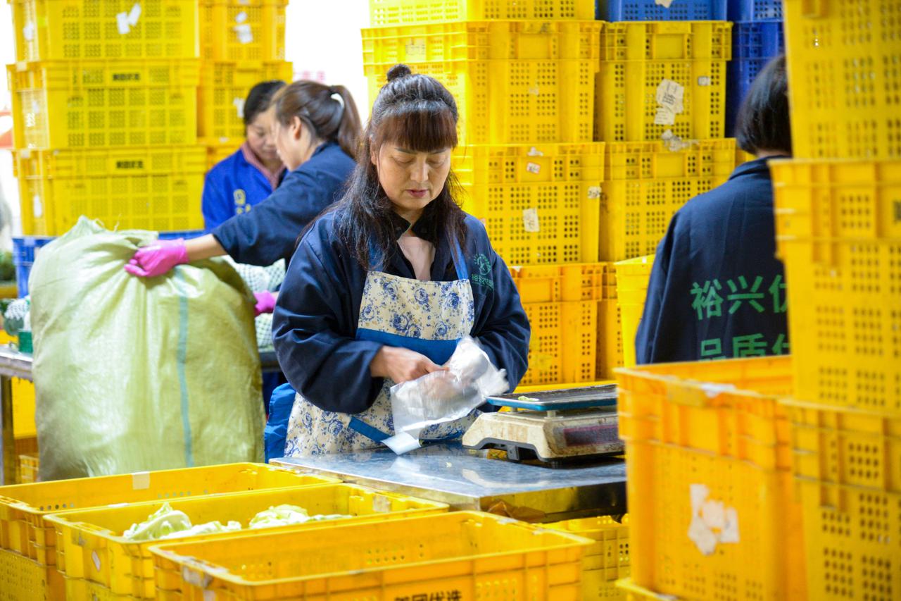 去头、剔叶、装箱、称重、封装,在四川裕兴生态农业有限责任公司的蔬菜处理厂房里,工人们手脚麻利地将一箱箱处理好的三青笋整齐堆放;而在该公司标准化蔬菜水果分装中心,工人们分工则各不相同,小米辣去蒂、洋葱剥皮、花菜分装……工人各司其职、低头忙活。