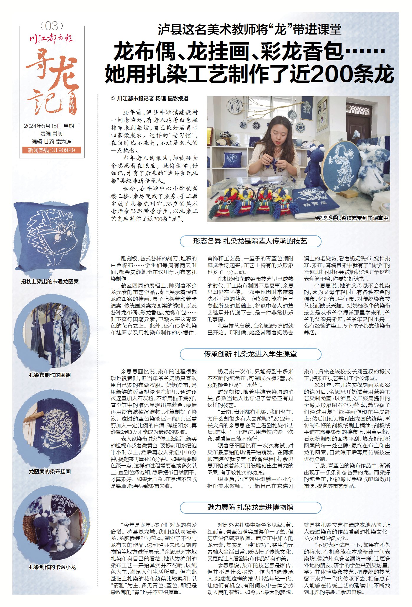 “今年是龙年,孩子们对龙的喜爱倍增。泸县是龙城,我们也以雨坛彩龙、龙脑桥等作为蓝本,制作了不少与龙有关的作品,送到泸县宋代石刻博物馆等地方进行展示。”余思思对本地扎染布有自己的看法,她认为泸州的染布工艺一开始其实并不花哨,以纯色为主,满足人们生活所需。