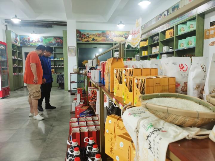 另一边,在永丰村的“丰收里”综合服务中心,正在展示的永丰大米、米露、米花糖、手工水豆豉等以永丰命名的特色农产品,吸引了诸多游客的目光。记者注意到,一旁的直播间内,两名直播人员正在进行着直播。