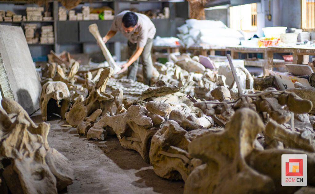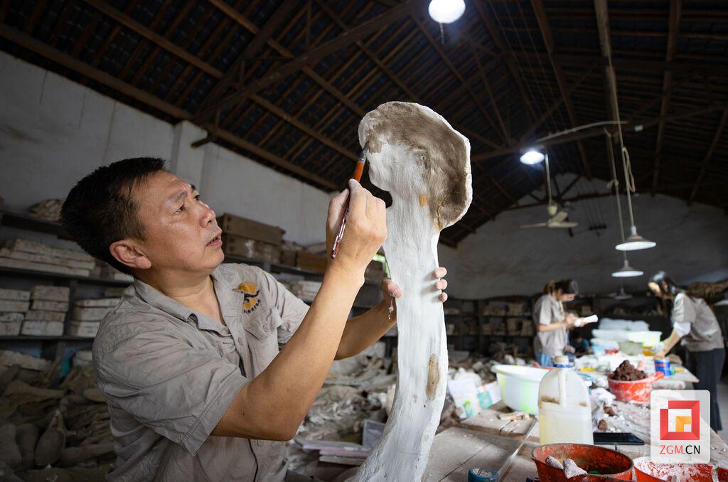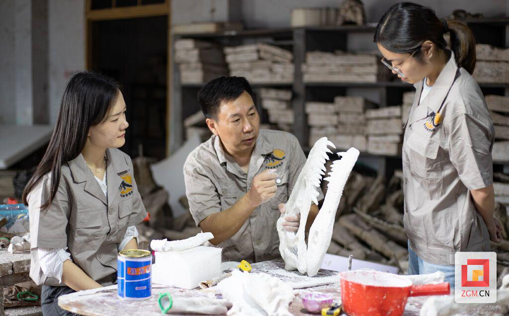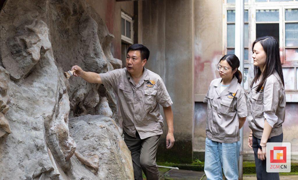 “嘭嘭嘭……哒哒哒……”在自贡市大安区大山铺镇的一个不起眼的院落里,每天都会传出各式工具的合奏曲,这便是恐龙馆化石标本修复与复原工作的场所。“这是甘氏四川龙头部的化石标本,在复原时要采用从外到内、从高到低的原则对牙齿进行复原。”自贡恐龙博物馆陈列部负责人胡永忠身着工作服,脸庞被阳光晒得黝黑,汗水浸湿了额头,依旧一丝不苟地向两名晚辈嘱咐道。