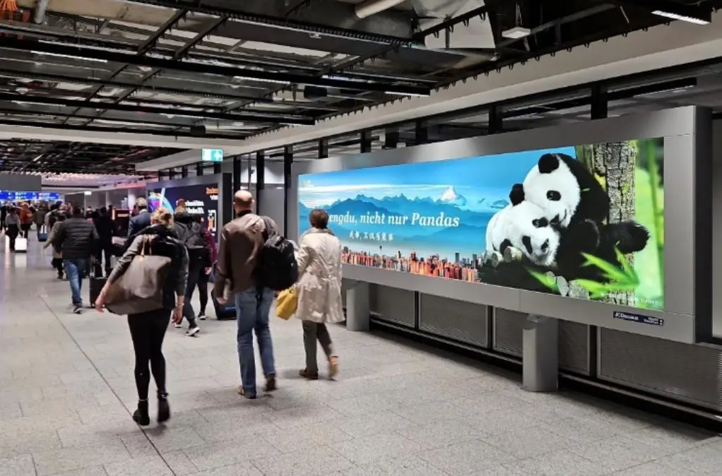 2024年,在法国巴黎,“大熊猫来了”文化艺术展在巴黎中国文化中心揭幕,熊猫故乡圈粉无数;在德国,法兰克福机场巨幅海报“Chengdu,nicht nur Pandas”(德语“成都不仅有大熊猫”)抓牢游客眼球;在西班牙,“成都旅游驿站”开到了全球最大规模观光巴士City Sightseeing上……