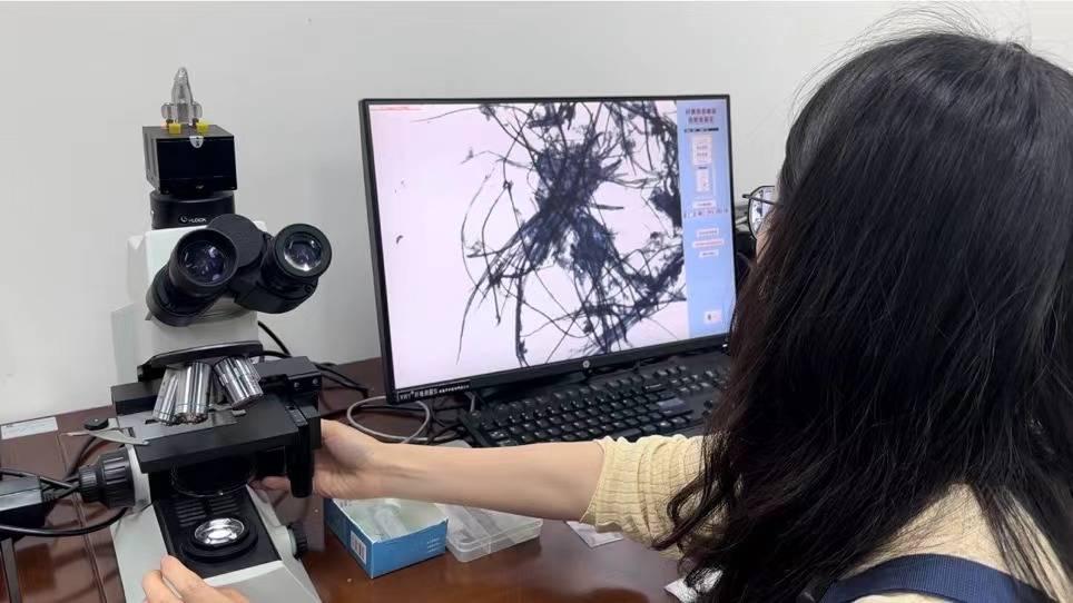 “在每种古籍修复之前,要先对它进行档案记录。其中就包括原书叶纸张的厚度、白度、酸碱度、纤维分析等数据。”王小敏身穿工作围裙,一手在显微镜上调整,不断放大载玻片上的纸张纤维,一手拖动鼠标,移动电脑上的标本图案。这些标本是对古籍进行初步整理时脱落下来的碎片,“古籍修复要做到‘最小干预,修旧如旧’。找到和古籍最接近的补纸,是修复中很关键的一步,纤维分析可以帮助我们确认纸张的材料。比如这个标本,纤维比较直,颜色呈蓝色,导管形状也比较清晰,可以判断出是竹纸。”