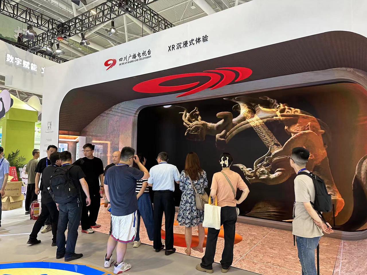其中,四川展区位于15号展馆,总面积810平方米,展区顶部环形LED屏滚动播放着三星堆、大熊猫的形象,四川元素妥妥的“吸睛”。展区内部分为“数字赋能新气象、数字转型新活力、数字消费新场景、数字文化新业态”4个板块,展示四川文化产业高质量发展取得的新成效。值得一提的是,三星堆新出土文物——戴金面罩青铜人头像、青铜扭头跪坐人像、青铜着裙立人像文物复制品也来到了文博会的现场,让现场观众不用去四川,也能一睹珍贵文物的风采!