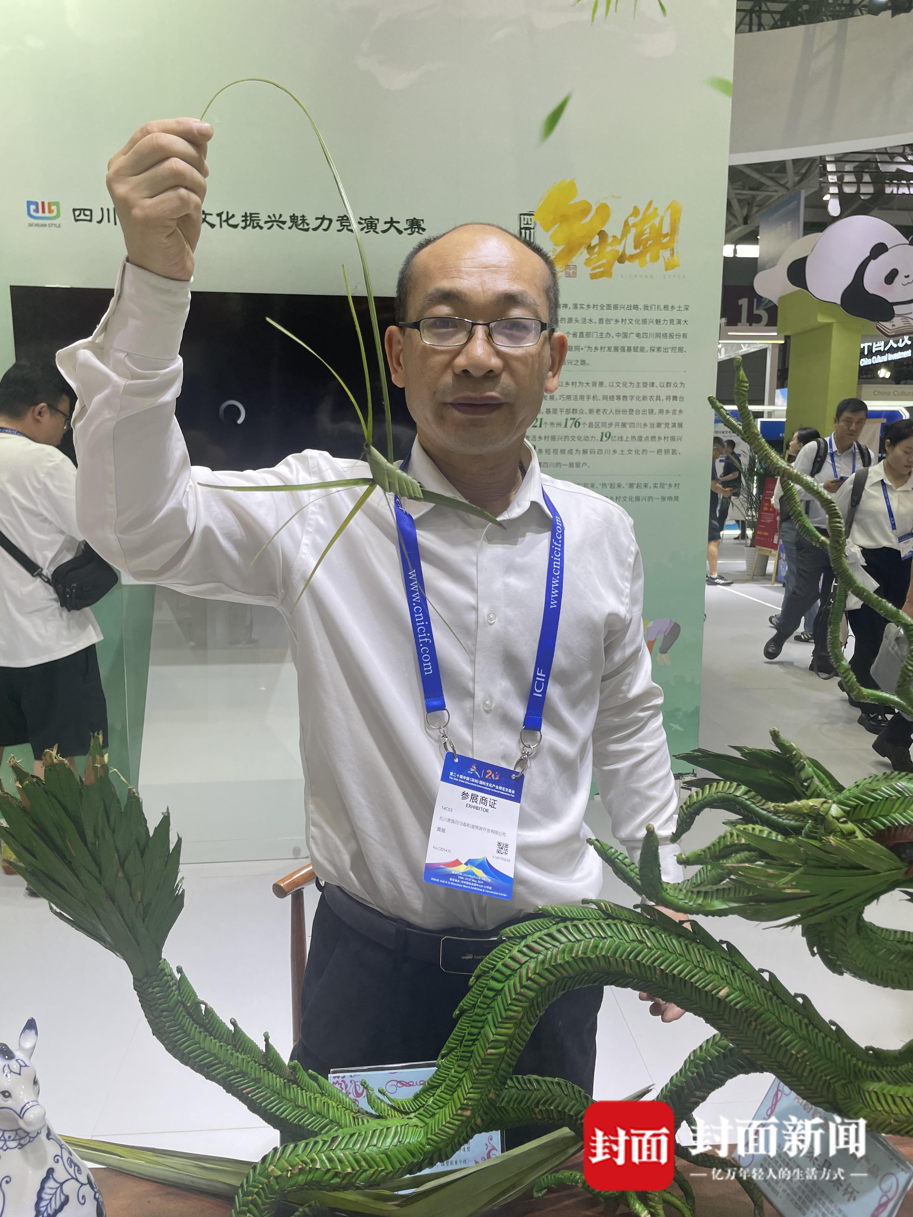 “其实,不管是草编还是竹编,它原来都是老百姓生活中的一部分,只是后来随着生活的变化,新材料、新技术的产生,传统的手工艺受到了冲击。”但现在,随着非遗传承人经过研究,结合现代人的生活和审美开发出来的文创产品,也让传统文化重新融入当下人们的生活中。“你看现场的文创产品,它都是很接地气,可以直接在生活中使用。比如这套与大熊猫元素结合的竹编茶具,还有茶叶罐等,就很受消费者的喜爱。”