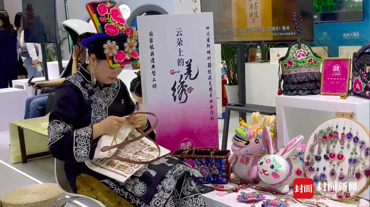 在实用的帆布包上,用羌绣的传统技艺,绣出来自三星堆遗址的青铜大立人、青铜纵目面具,会碰撞出怎样奇妙的火花?在四川展馆中,就可以看到这样一款精美的文创产品,它是被阿坝州羌族刺绣传承人张居悦,用一针一线绣成,亮相四川展馆中。