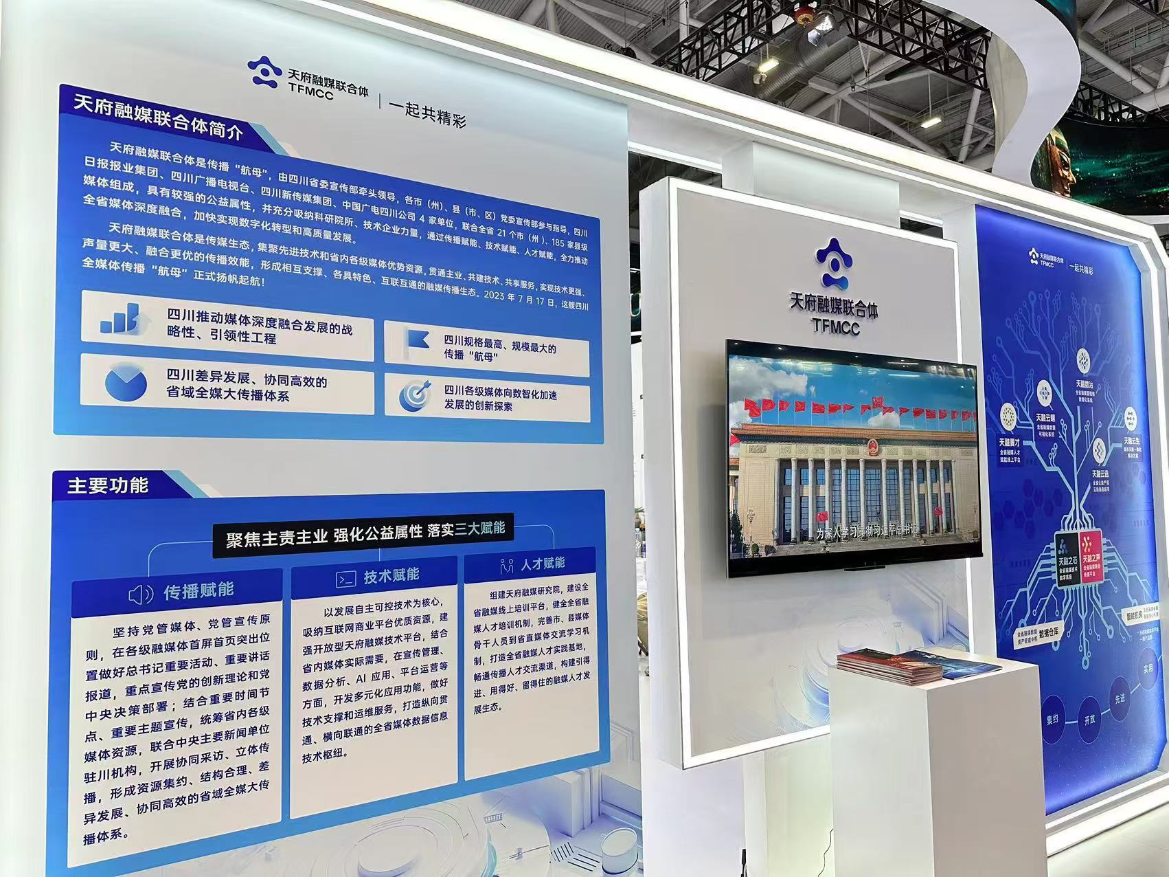 进入四川展区,天府融媒联合体尽显文化数字化建设新气象。这个由四川省委宣传部牵头,四川广播电视台、四川日报报业集团、四川新传媒集团、中国广电四川公司4家单位,联合全省21个市(州)、185家县级媒体组成的传播“航母”,正在全力推动全省媒体深度融合,加快实现数字化转型和高质量发展。