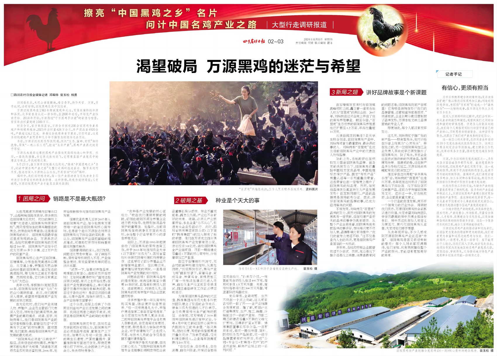 为此,由四川日报报业集团主办的“擦亮‘中国黑鸡之乡’名片,问计中国名鸡产业之路”大型行走调研报道近日启动,本报记者深入万源的山山水水,开展了首站万源“问诊”调研,今日推出报道《渴望破局 万源黑鸡的迷茫与希望》。