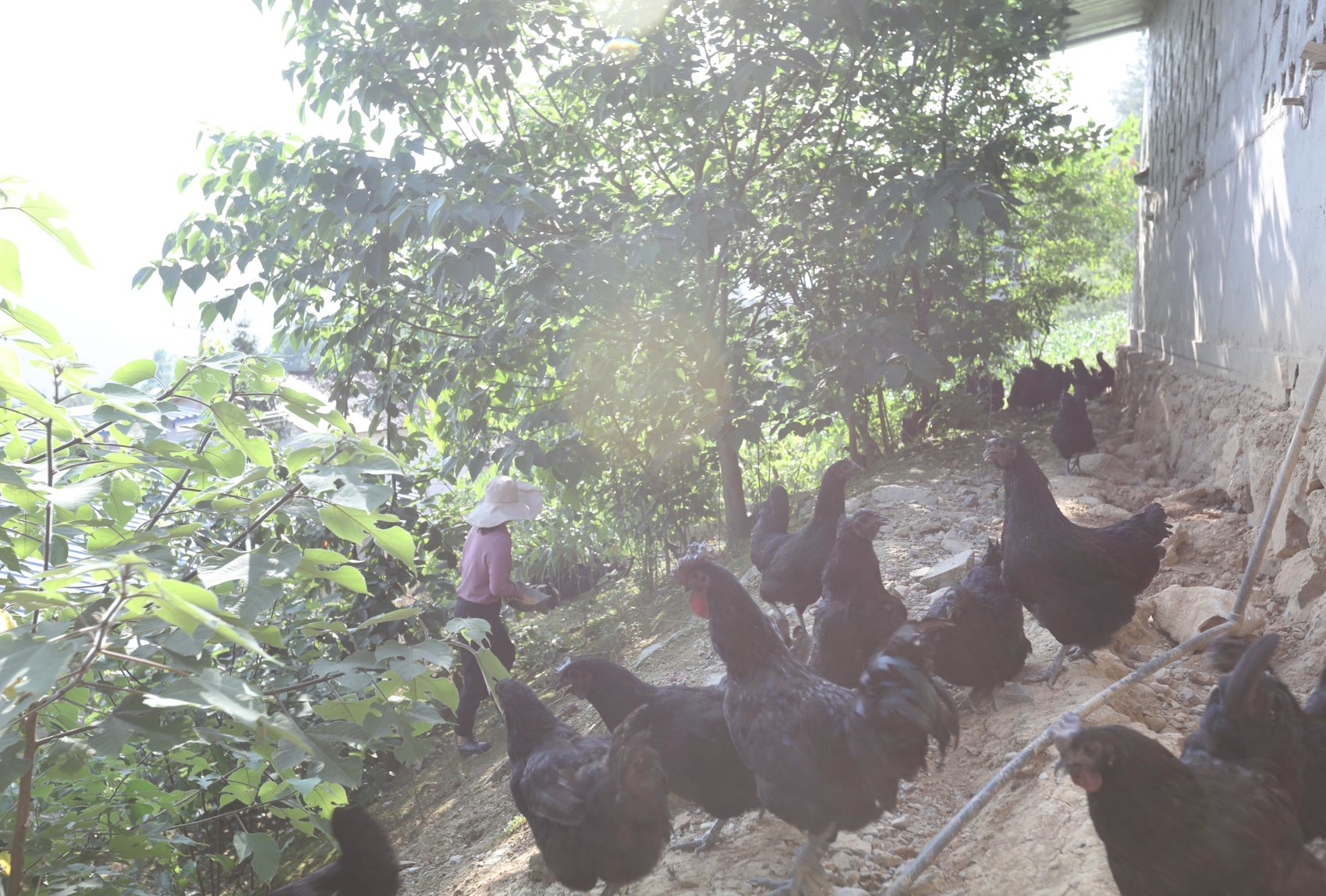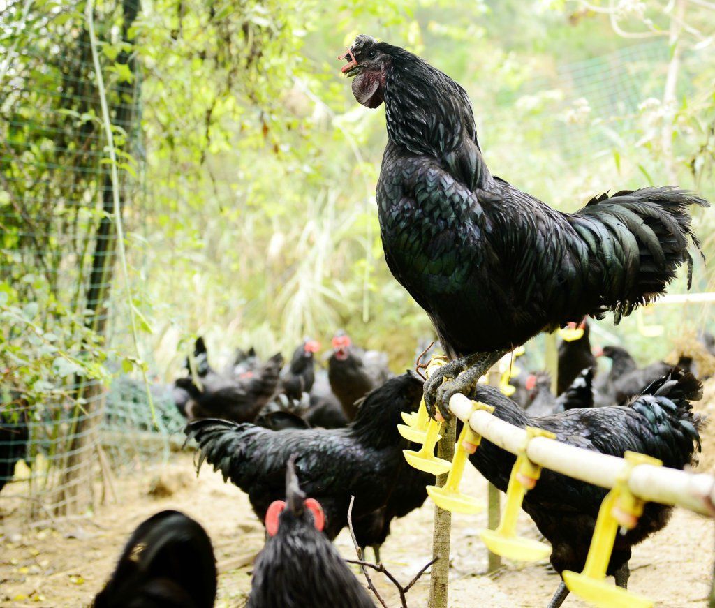 散养的旧院黑鸡。