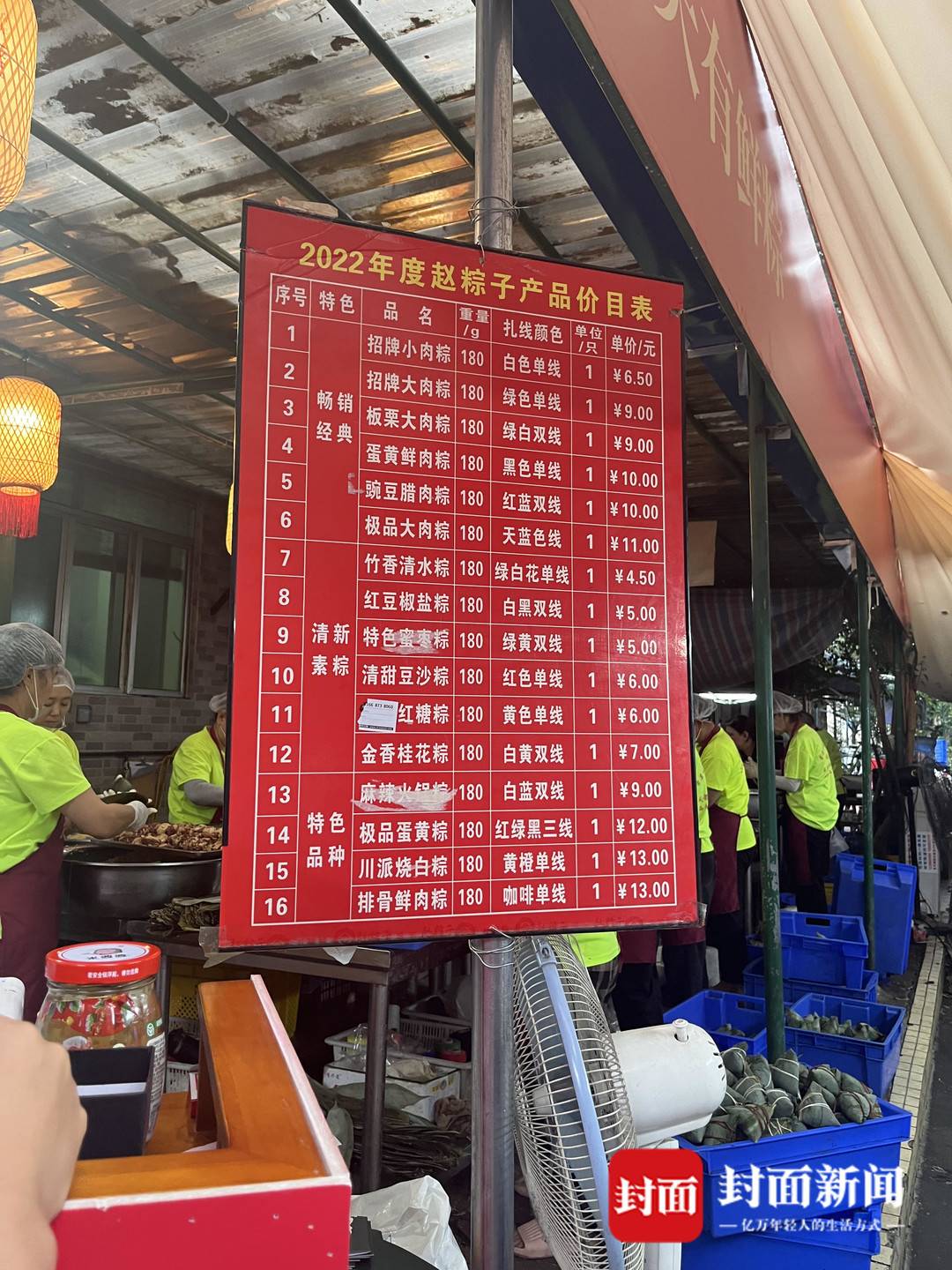 往里走就能看到赵粽子的门店了,切、配、包、煮、晾、装、卖……操作棚内员工“各司其职”,棚外市民排起了长队。