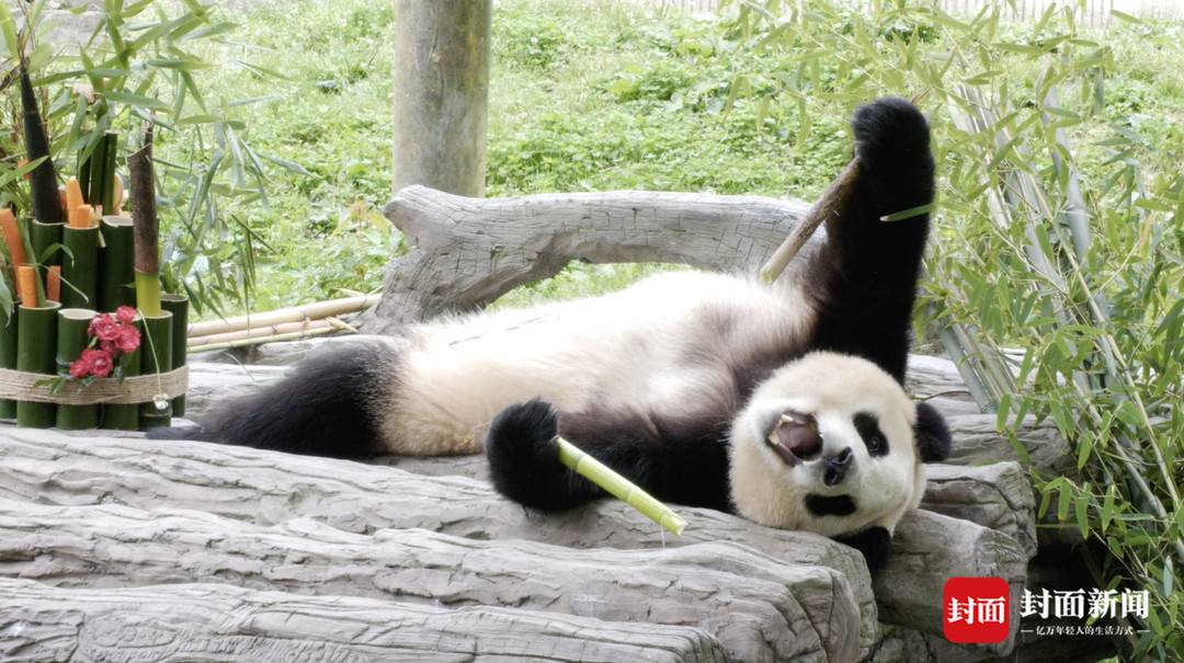 上午9点40分左右,“福宝”从内舍往外探出头,右脚先迈出步子,穿过小门,缓缓走向外舍。它四处巡视嗅闻,看上去似乎很满意自己的新家,随后攀上木架,在奶爸们提前准备的“零食大礼包”面前坐下。零食包里有新鲜竹子、胡萝卜、竹笋,小吃货“福宝”拽起一根又一根,开启沉浸式“炫竹”吃播。坐累了,再躺下,竹不离手,主打一个悠然惬意、情绪稳定。