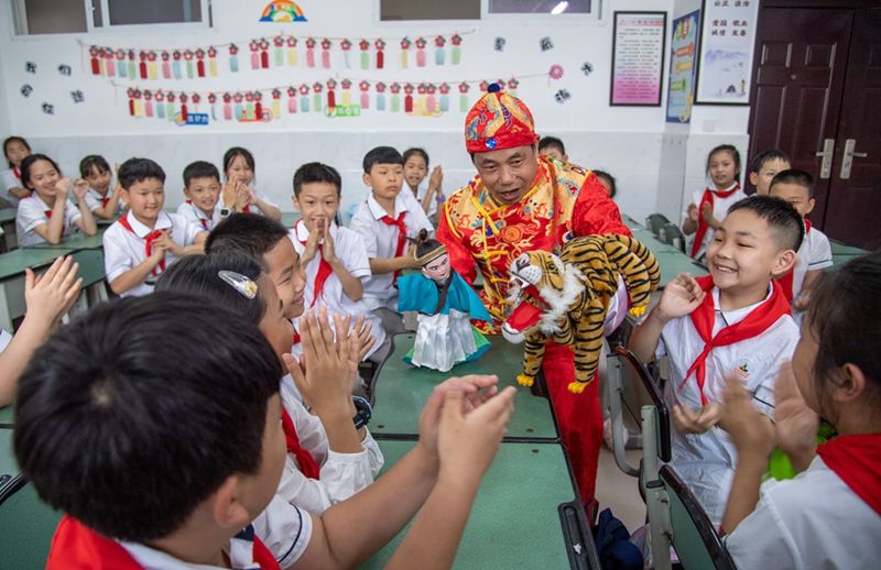 6月5日,在广安市广安区北仓路小学四年级一班教室,非遗传承人张贤光在向同学们讲解手掌木偶戏技艺。新华网发(张国盛 摄)