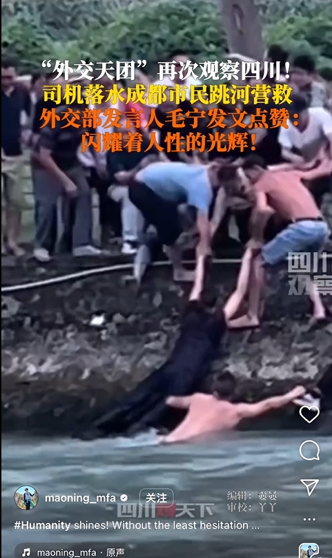 近日,四川成都,一车辆坠河被冲走,司机被困。2名路人跳水砸窗救人。靠近岸边时,其余路人纷纷前来帮忙,搭“人链”将被困人员拉上岸。6月17日,外交部发言人毛宁在社交平台发文点赞此事:闪耀着人性的光辉!
