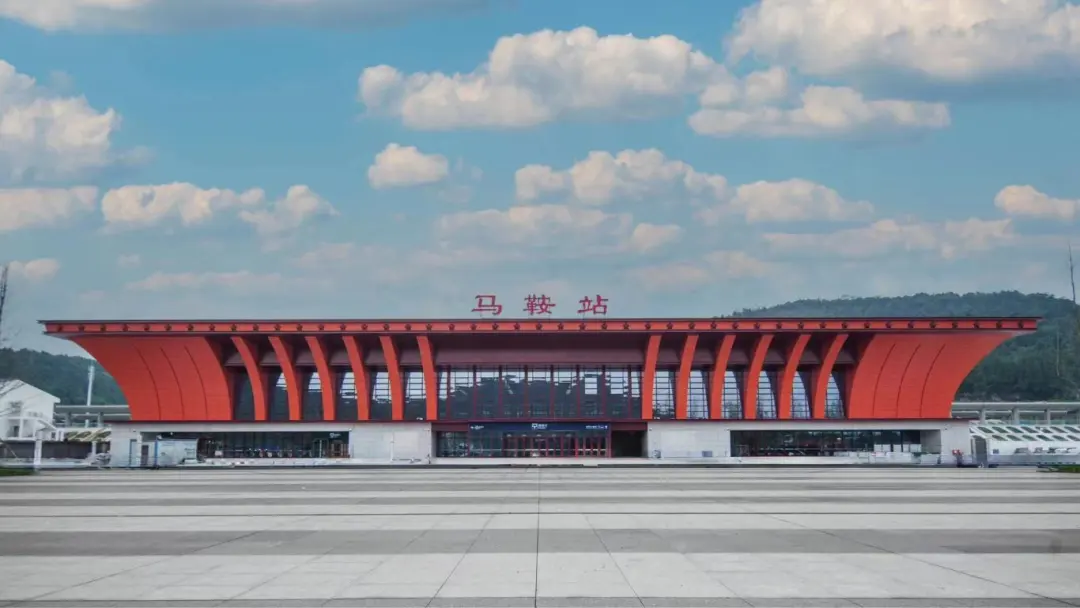 马鞍站站房总建筑面积7000平方米,拥有2个站台4条线路,年旅客发送量近期100万人,远期190万人。站房外形以“德耀中华,光辉马鞍”立意,细节处融入五角星等红色元素,以现代的建构表达,体现马鞍作为朱德故里的城市特征和作为革命老区的独特魅力。