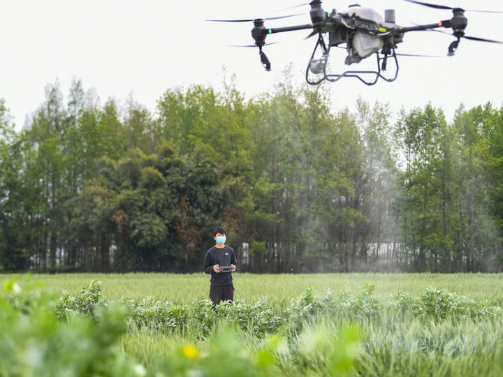 2024年3月26日,在四川省成都市崇州市隆兴镇,农机手王李锐在操作植保无人机进行冬小麦田间病虫害防治。新华社记者 王曦 摄