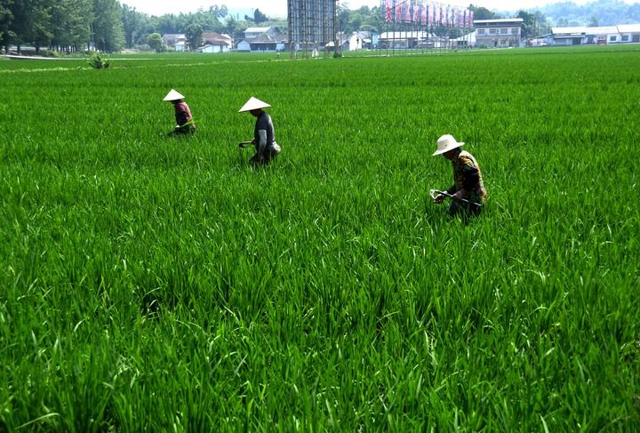 2024年6月13日,在四川省绵阳市安州区塔水镇双埝村的水稻制种现代农业园区内,几名农民在水稻田里除草。新华社记者 高健钧 摄