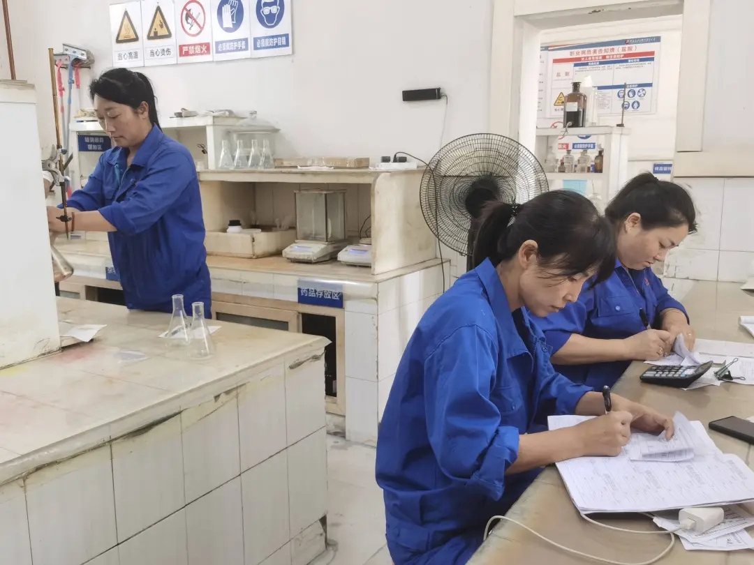 苏礼祝(左一)在岗位上和同事记录化验参数