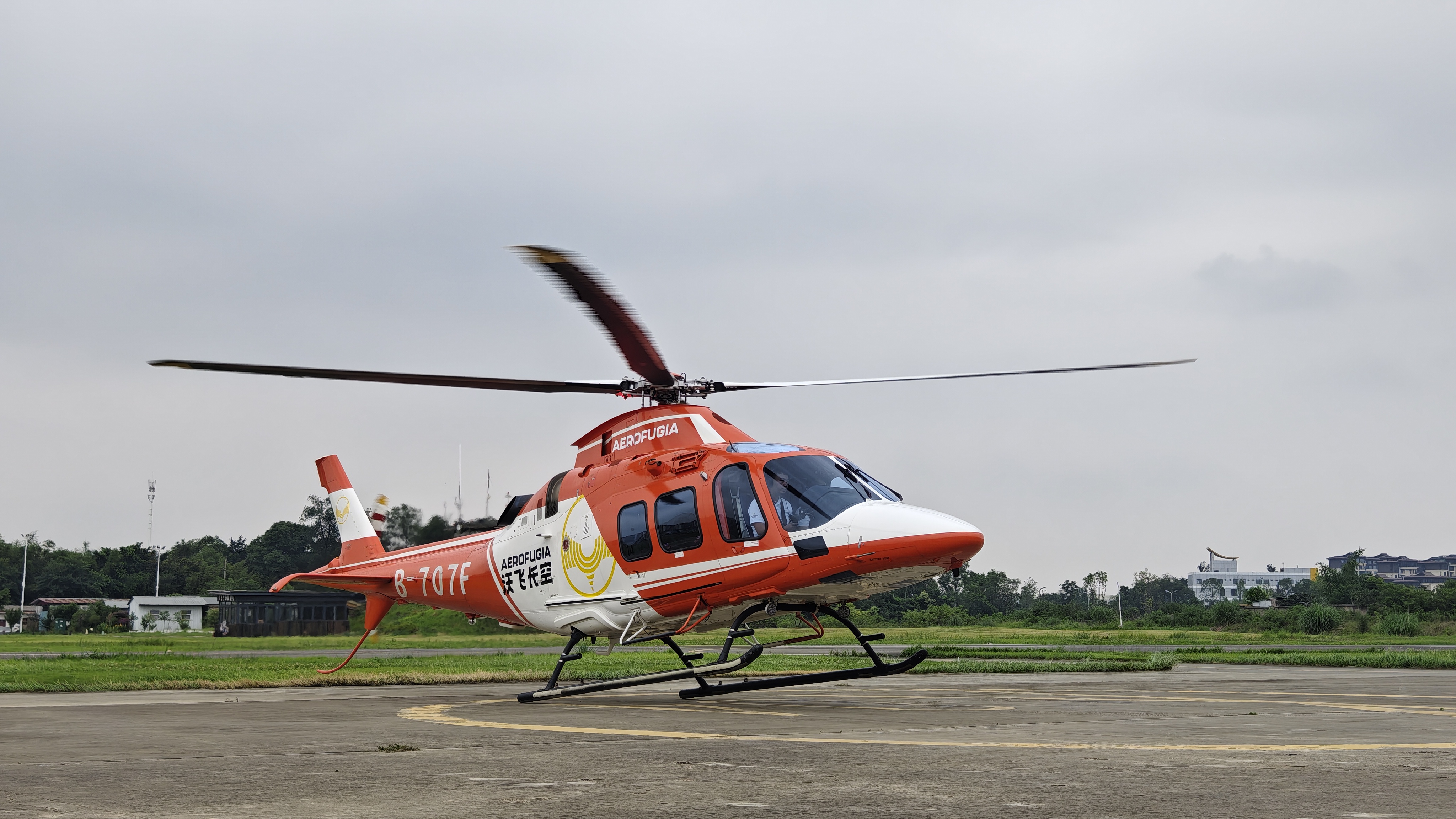 上午9点30分,一架橙白相间涂装的直升机做好安全检查和准备工作在洛带通用机场等候指令。“准备完毕”“起飞”,9点35分,直升机起飞。