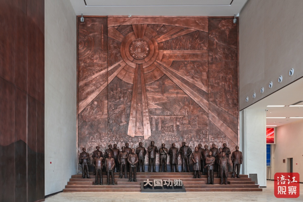 在四川两弹城博物馆一楼大厅,左侧是反映“两弹一星”精神的“干惊天动地事,做隐姓埋名人”标语和“两弹一星”功勋奖章;正面的大国功勋纪念浮塑,是23位“两弹一星”功勋奖章获得者的雕塑。
