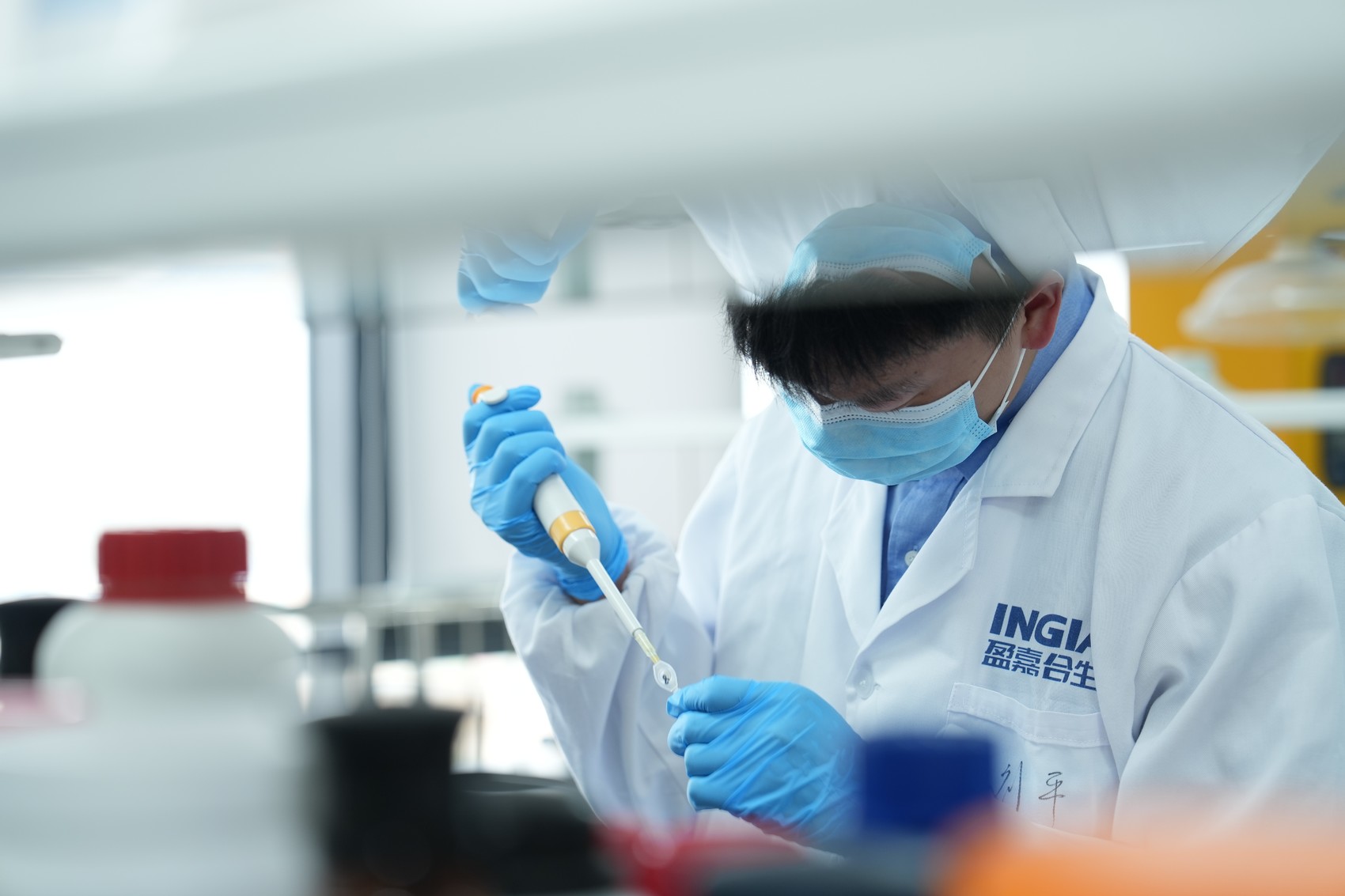 盈嘉合生的工作人员正在进行菌种发酵工艺优化操作