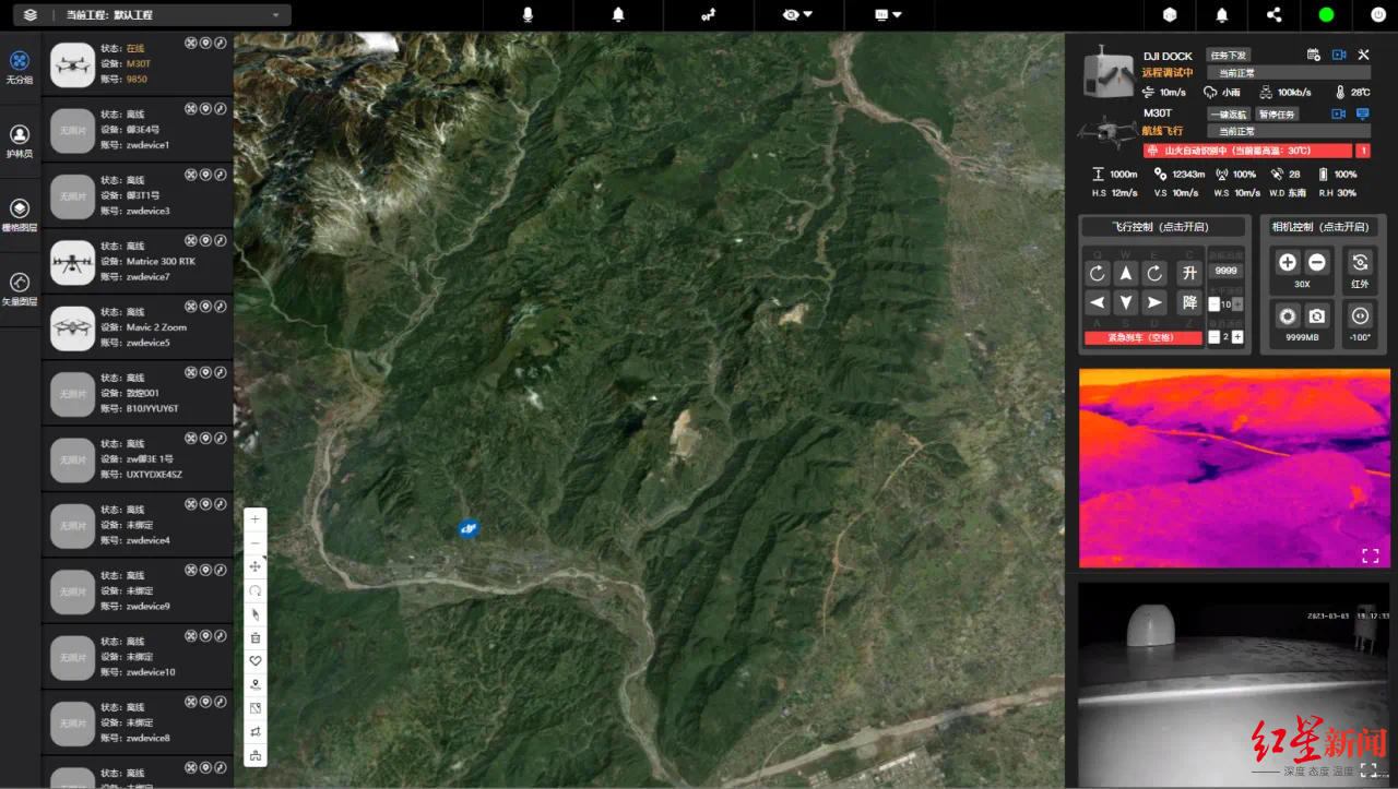 当天,测试团队利用大疆无人机设备,在成都东部新区境内的龙泉山上,布置了一个自动化的无人机机场系统,通过后台操控,实现自主飞行、自主巡检。陈尧说:“这台无人机在满电的情况下可续航30公里,以无人机机场为原点,可以覆盖半径10公里的巡视范围。利用无人机自动采集目标林地影像数据,结合GIS系统进行林地测量,能够实现全天候、全方位的火情监测与预警,有效预防森林火灾的发生。”