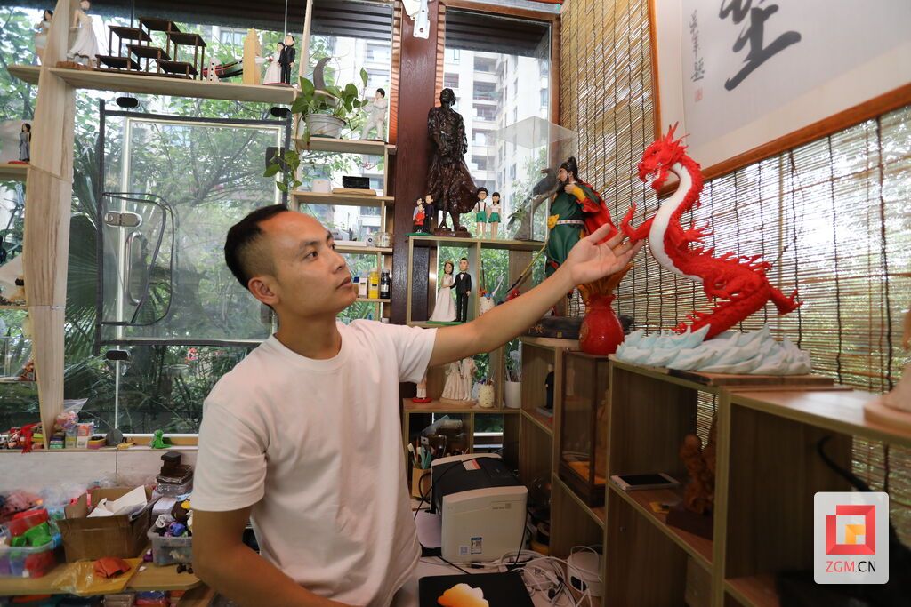 “今年灯会期间,有近百名小孩来互动体验,捏的基本都是龙鳞这个部分,最后我再整合起来完成了这个作品。”指着陈列柜上方一条红色的“龙”,胡伟康向记者谈起了自己传承非遗技艺的“新成果”。“我们胡氏泥塑用的是人工合成的软陶土,不用后期上色,也能让作品保存得更久……”介绍起胡氏泥塑的特点,他如数家珍。