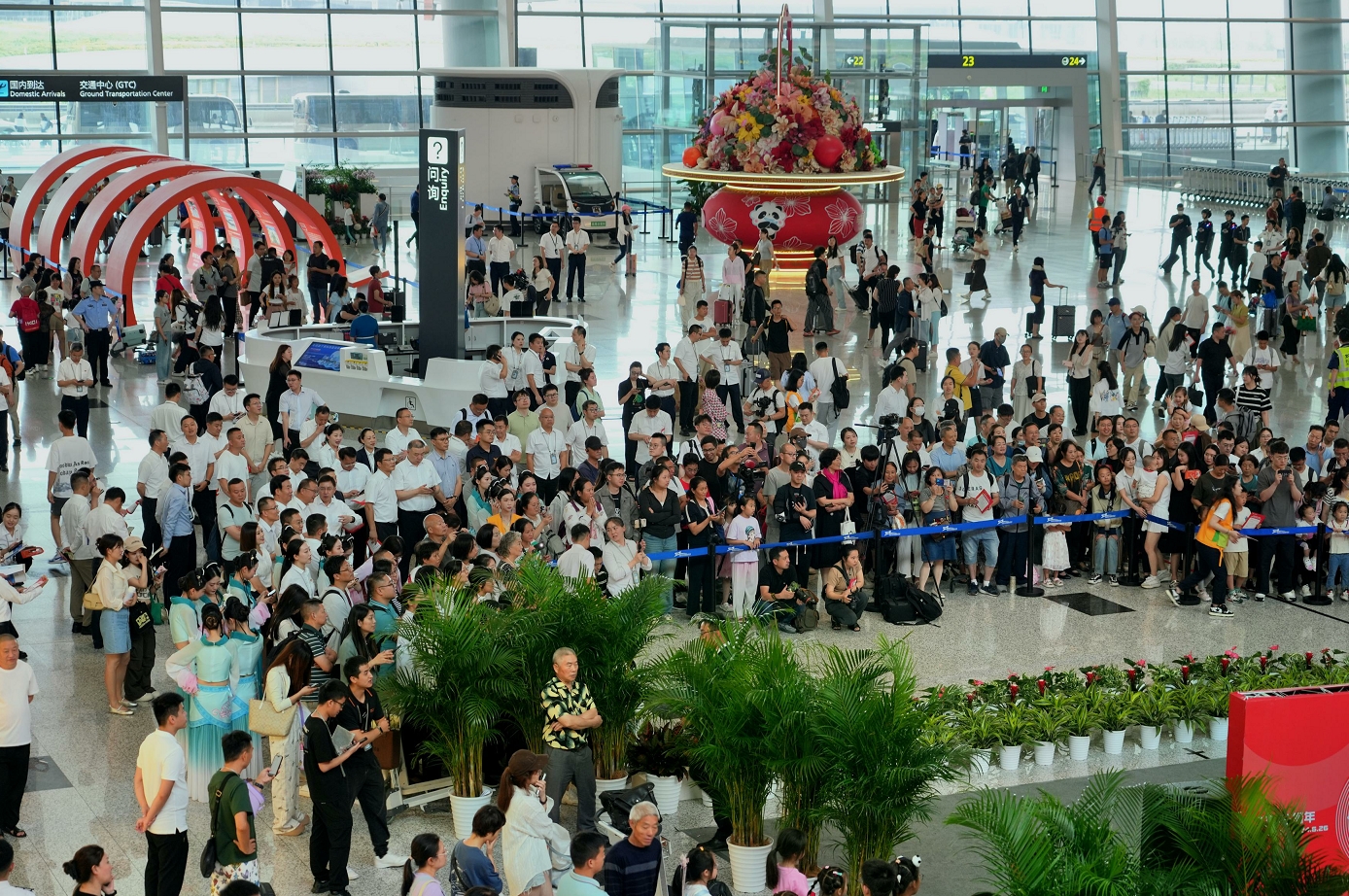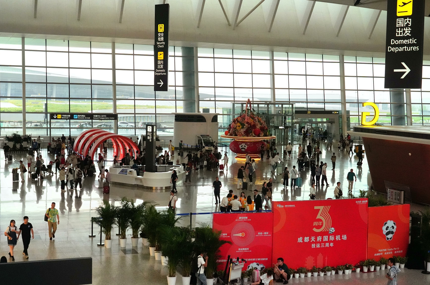 “第一次来成都中转,非常便利,给我们留下了非常好的印象,所以返程我们也选择了在天府机场中转回广东。”6月27日,天府机场联合航司在T2航站楼举行了三周年主题音乐活动,吸引了众多旅客驻足观看。