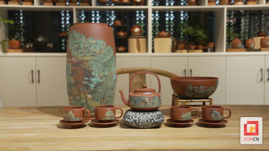 四川荣县是中国西部陶都,有着二千多年的制陶历史。“荣县土陶”被国家商标局批准为地理标志证明商标,其制作技艺被确定为省级非物质文化遗产,入选第一批四川省传统工艺振兴目录。近年来,荣县土陶从传统土陶迈向精品陶器,一个个普通的荣县土陶经过非遗代表性传承人之手大放异彩,刻刀精雕,画笔细描,大大提升了荣县土陶的观赏性、艺术性、附加值。荣县青年艺术家丁玉蝶在荣县土陶的绘画创作中不断探索和突破,将传统绘画技艺与现代艺术风格相结合,为荣县土陶注入新的活力。此次大赛,丁玉蝶带来了2组荣县土陶作品参赛。其中《石笋山居图》玉壁提梁壶山水套组获得大赛“转化推广奖”。
