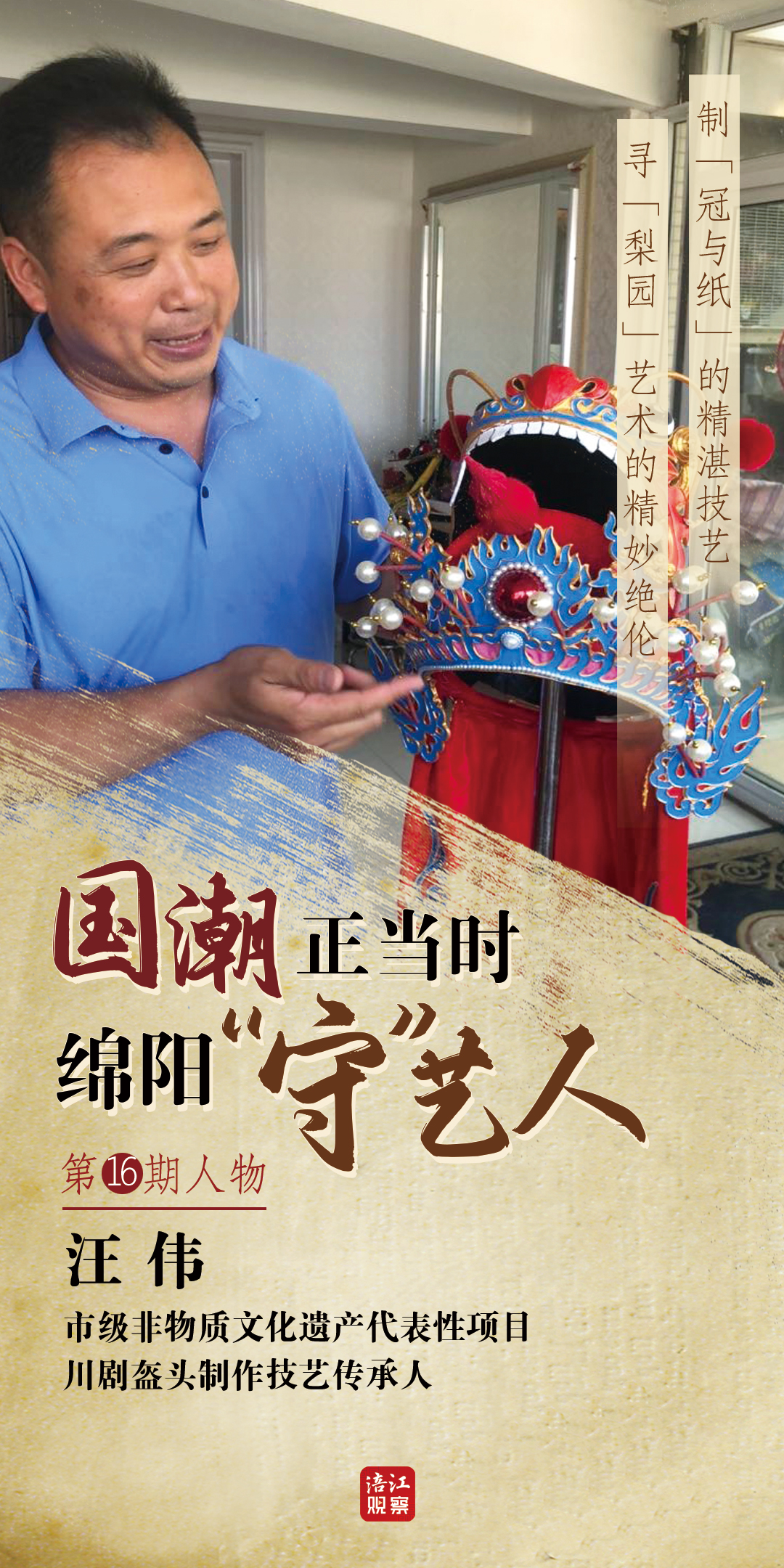 2002年,汪伟辞去了稳定的工作,从铁杆戏迷“转正”为专业的川剧演员,同时还不断提升制作盔头的技艺,衍生出市场需要的川剧盔头的文创产品。