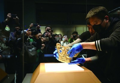 1月29日,三星堆“国宝”在上海博物馆东馆特展厅内开箱,工作人员将金面具移入展柜。新华社发