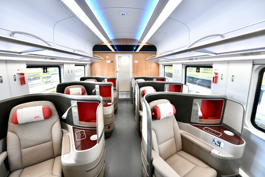 在旅客乘坐舒适性方面,商务座座椅区采用大曲面造型设计,配置了电动调节、无线充电、储物台、折叠桌板、智能交互终端等,一等座和二等座座椅区设旋转座椅和小桌板,进一步提升了旅客乘车体验和出行品质。