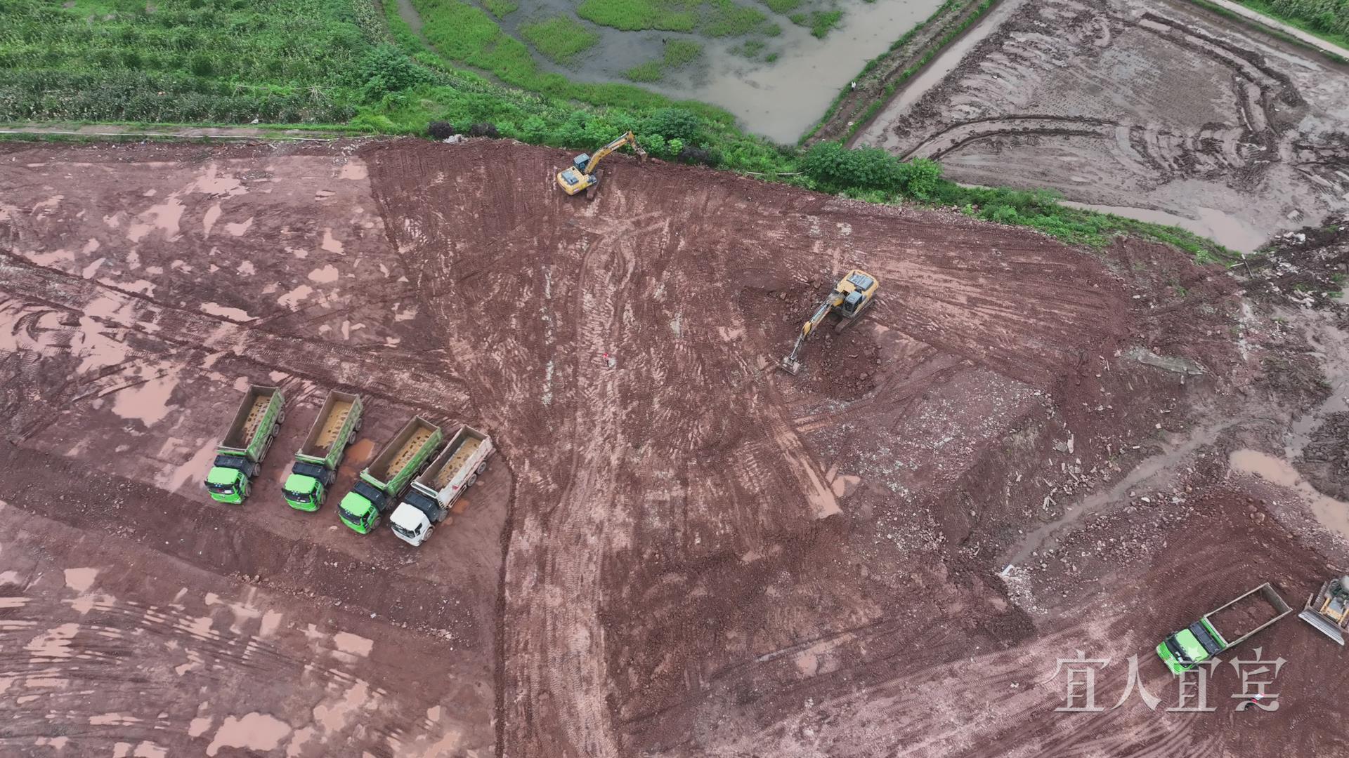 宜宾固态电池研发基地项目负责人杨超介绍,整个场地现有10台挖掘机、2台推土机、40多辆运输车,通过“白+黑”“5+2”的工作模式,歇人不歇机器,力争在7月底完成整个场坪的所有土石方开挖工作,达到项目开工交付的条件。