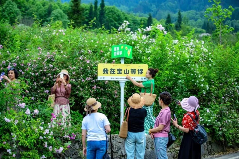游客们在彭州宝山村拍照打卡