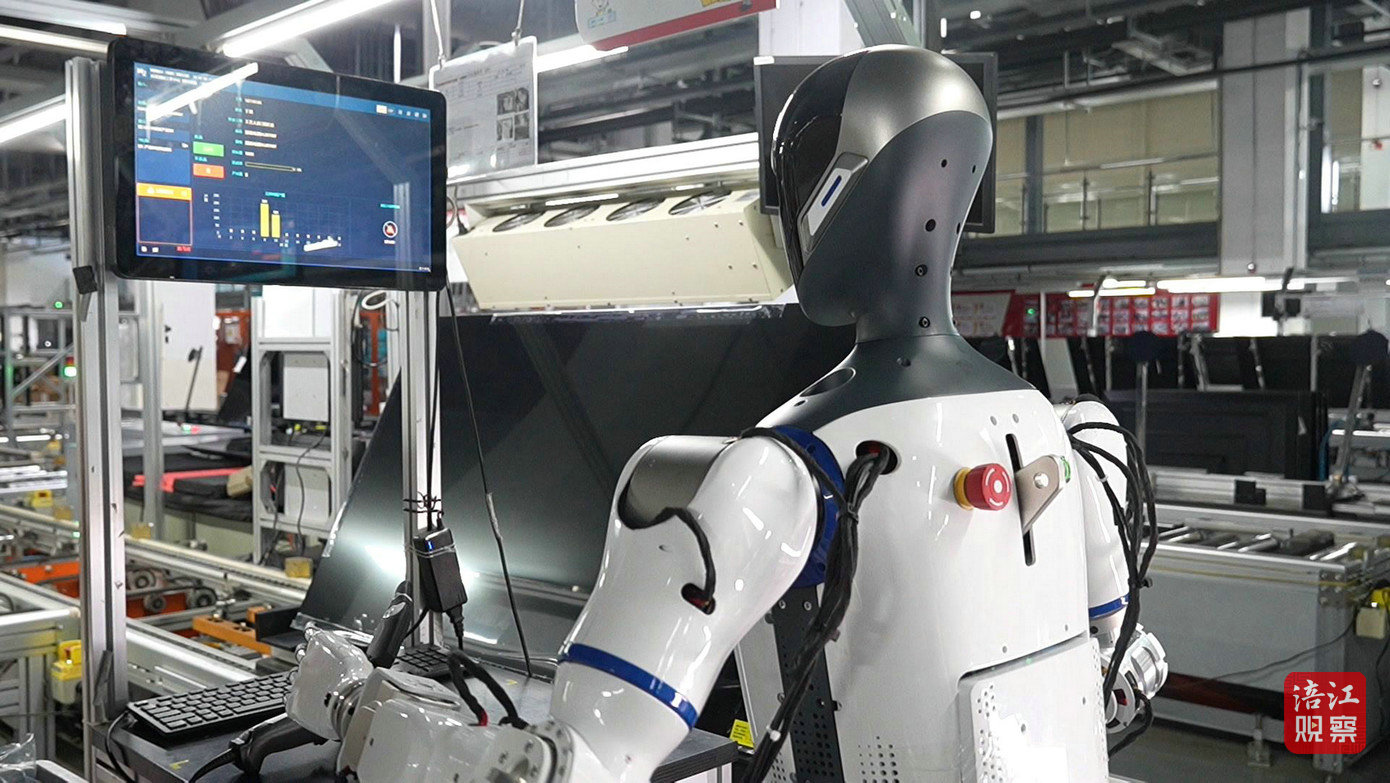 “我们看到,这款人形机器人在进行扫码贴签时,通过像人一样7个自由度臂和6个自由度手,以及全身协调力控技术就能完成操作,既灵巧准确又安全稳定。另外一个特点就是,这款机器人可以通过训练学习,适应不同规格、不同尺寸的电视机柔性生产需求。”中国兵器装备集团自动化研究所有限公司运动控制工程师张啸甫介绍。