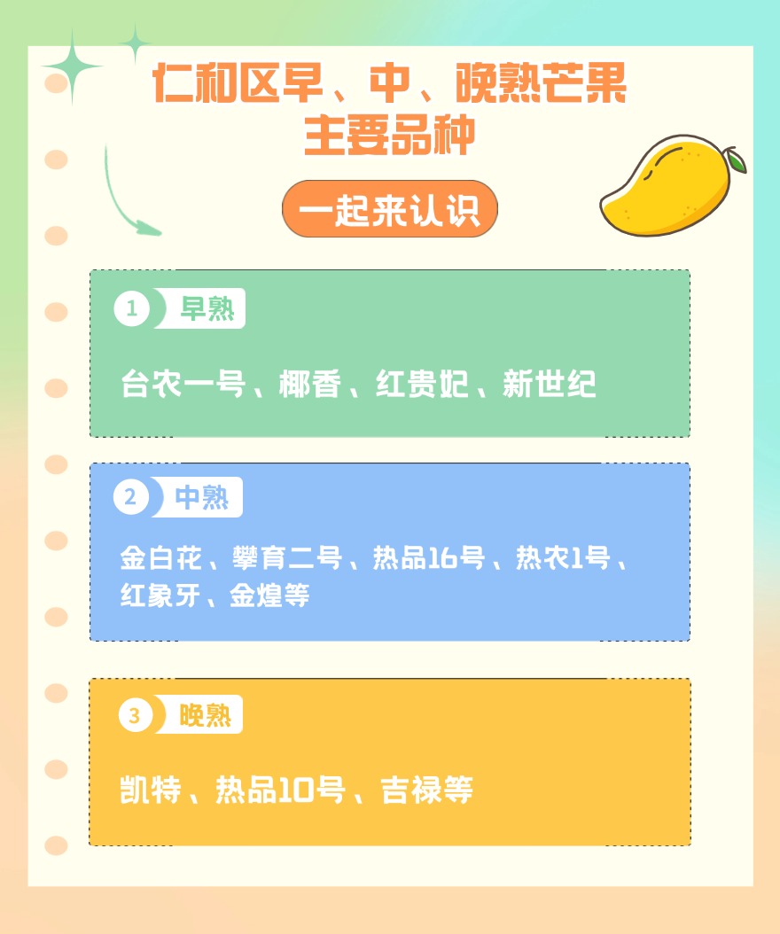 金煌、爱文、桂热82号、红贵妃、红瓦城、红玉、金白花、金星、玛莉卡、女儿红、岶拉英达、热农一号、热品10号、热研16号、台农1号、攀育二号、锐华1号、汤米、椰香、玉文。