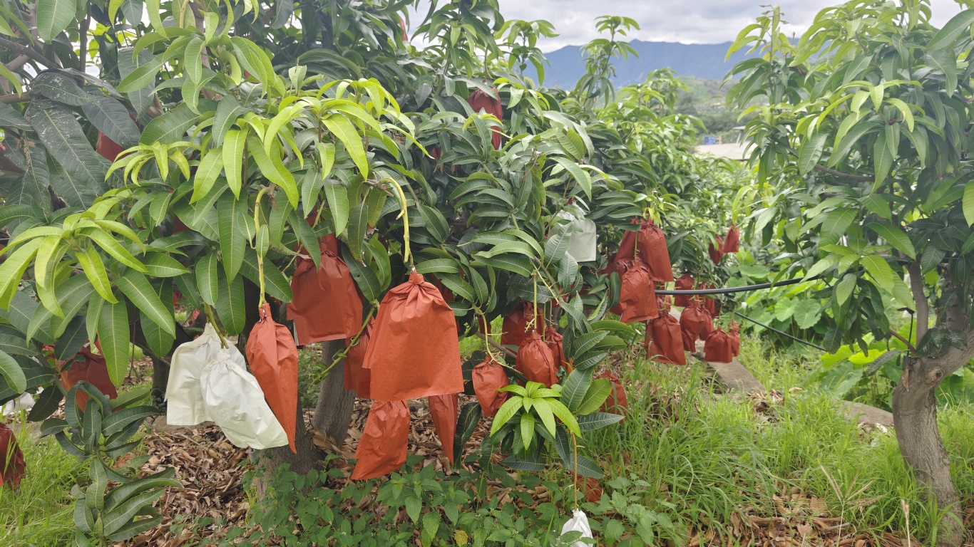 眼下,园内金煌、爱文、桂热82号等20个品种芒果树枝叶茂盛,套着袋的果实压弯了枝条,树下展牌介绍着品种名称、成熟时间、可食率等。