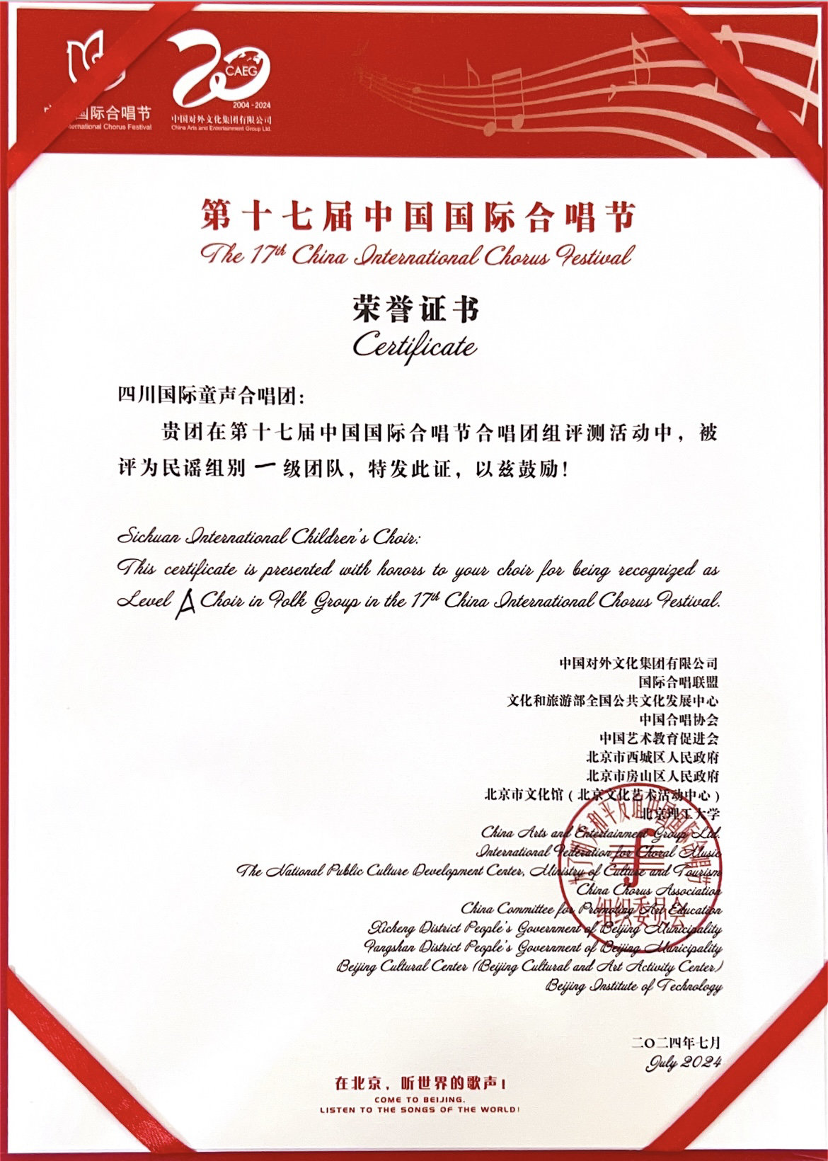 7月的北京骄阳似火,四川国际童声合唱团(以下简称“川童”)在滚滚热浪中传来捷报。继2023年在世界和平合唱节夺得金奖后,该团在7月19日闭幕的第十七届中国国际合唱节合唱团组评测活动中,从306支队伍中脱颖而出,被评为民谣组一级团队。据悉,川童是民谣组别中唯一一支来自四川的合唱队伍。