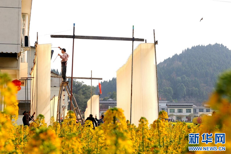 村民登梯晾晒中江挂面。新华网发(肖开丰 摄)