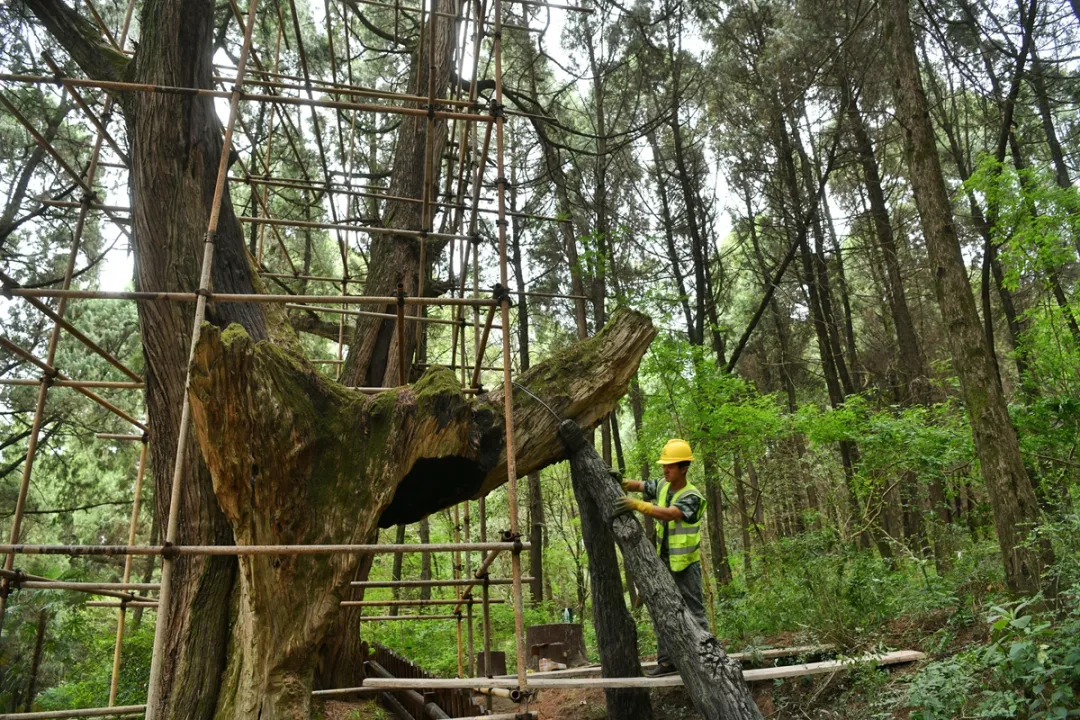 在剑阁,针对古柏存在的虫害、水土流失、自然衰老等问题,该县创新建立蜀道古树保护“林长+树长”模式,广泛开展“校+院+地”等合作,对长势衰弱的古柏采取地上环境综合治理、地下土壤改良等救护复壮措施进行辨证施治,全力以赴让长势衰弱的古柏焕发出新的生机。