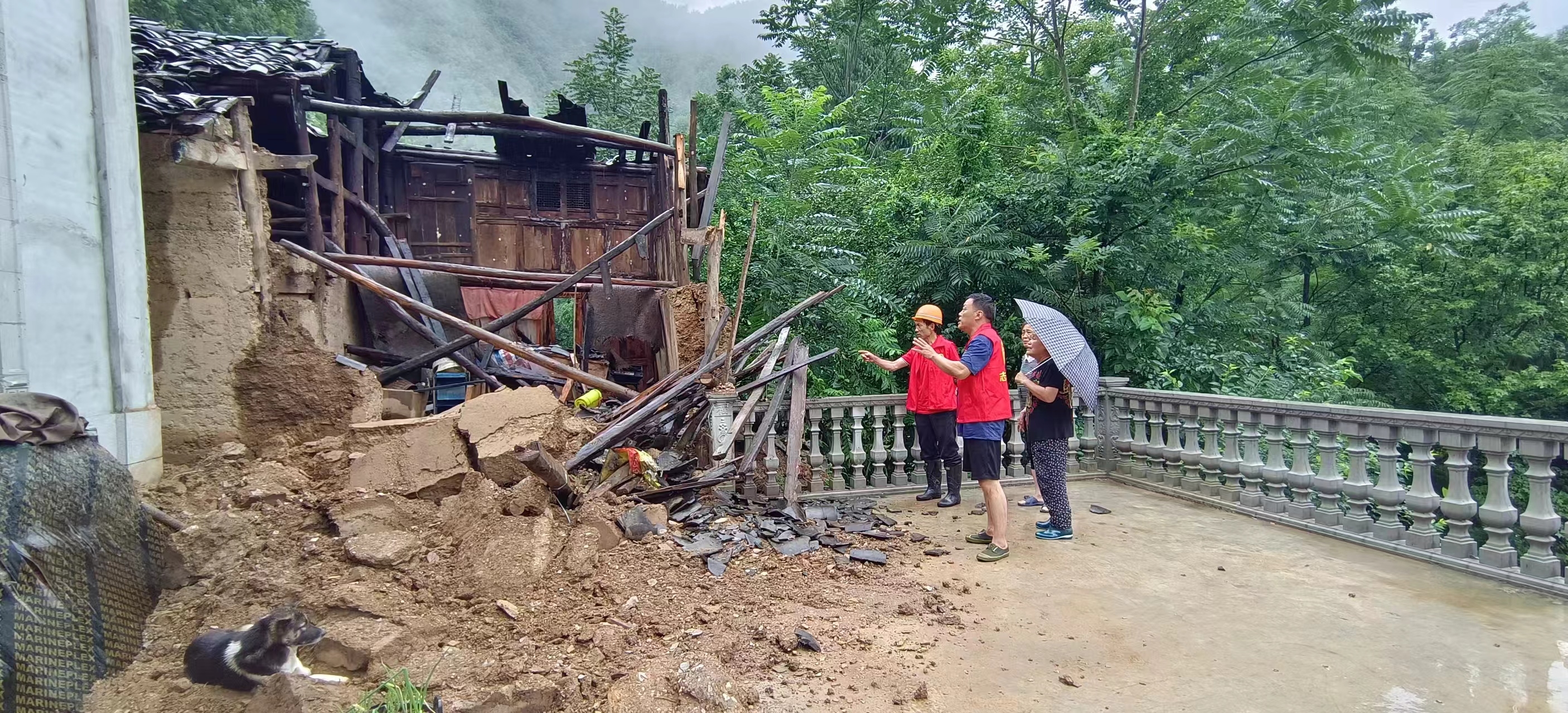 7月17日,朝天区朝天镇党员志愿者们在垮塌的旧房前排查安全隐患。廖睿文 摄