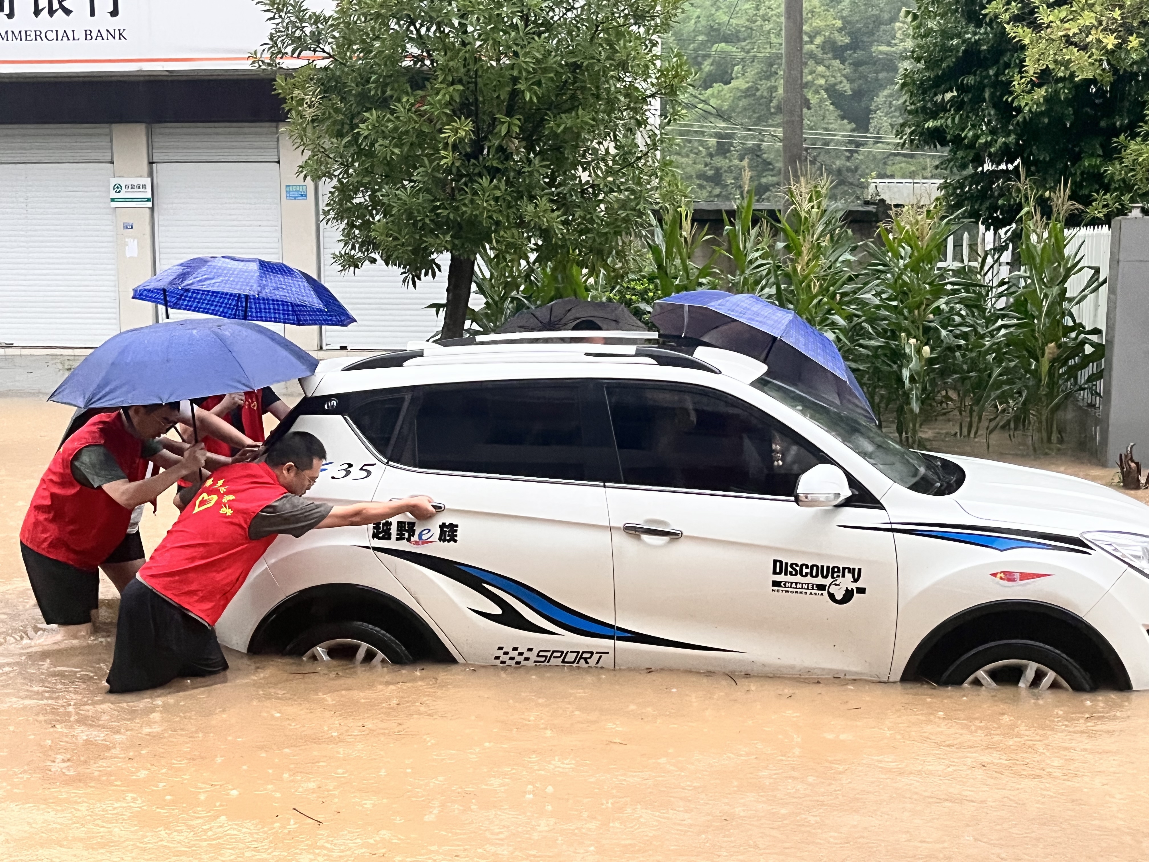 7月17日,青川县七佛乡党员干部在洪水中帮助推受损车辆。广元日报全媒体记者 鄢怀林 摄