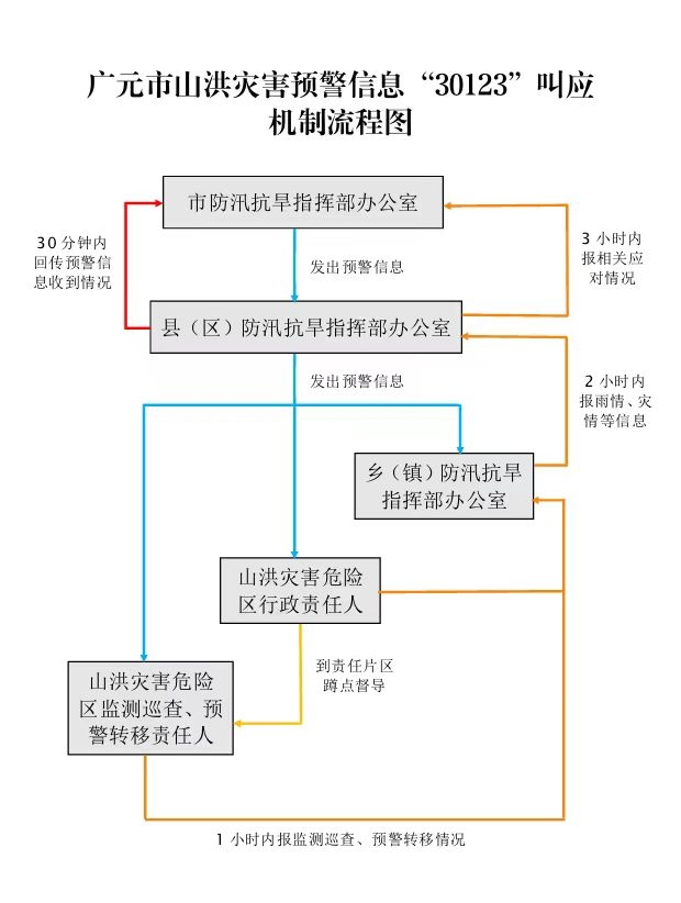 “30123”叫应机制,是指山洪灾害预警信息发布后,各接收单位30分钟内作出回应,村级(基层责任人)每1小时、乡镇每2小时、县级每3小时报告预警响应落实情况,直至受威胁群众转移完毕,并按照信息发布、接收回应、预警响应、措施反馈四个步骤,形成预警管理闭环。