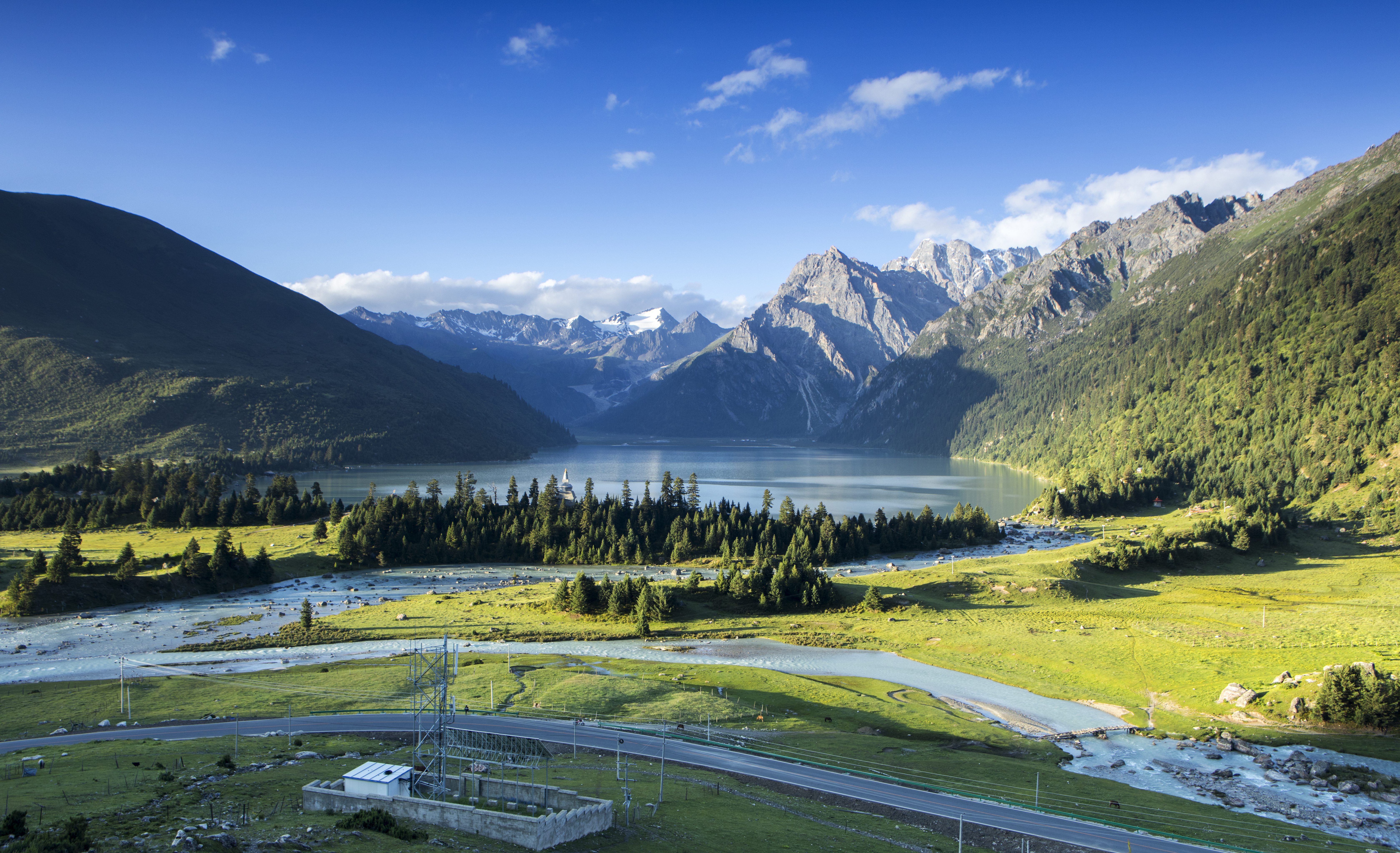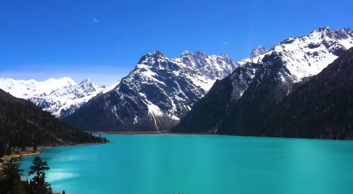 景区内,静谧秀美的玉龙拉措镶嵌在群山环抱之中,湖畔四周古树参天、草甸宽阔,海拔6168米的雀儿山主峰绒麦昂扎,巍峨地屹立于周围数十座5500米的群峰之上,晶莹的冰川顺山峰沟壑倾泻而下,在蓝天白云映衬之下尤为圣洁。