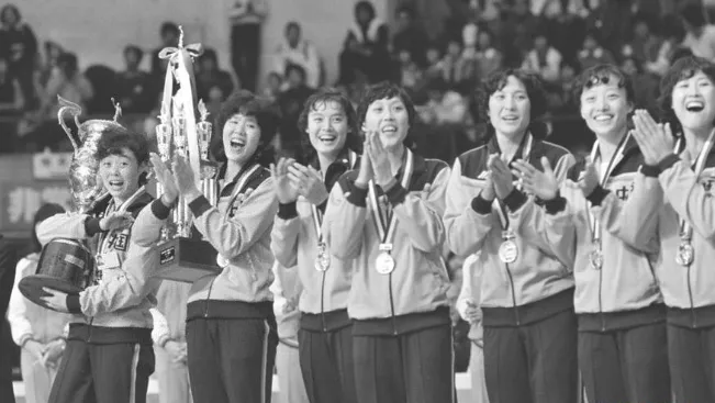1984年8月7日,中国女排在洛杉矶奥运会女排颁奖仪式上向观众致意 图据新华网