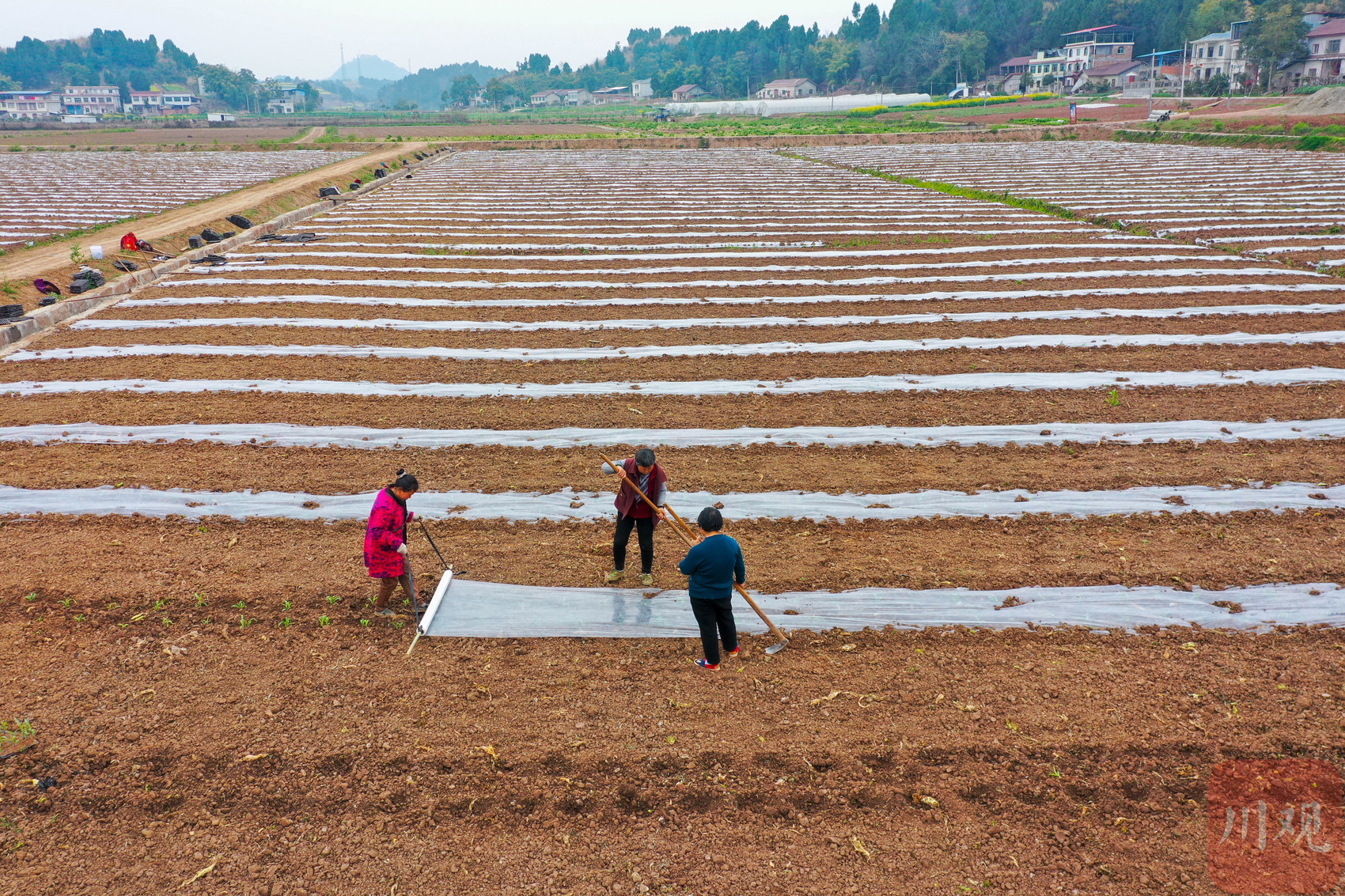 大英县象山镇青龙滩村,村民们在移栽玉米苗。遂宁观察 刘作鹏 摄