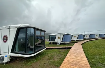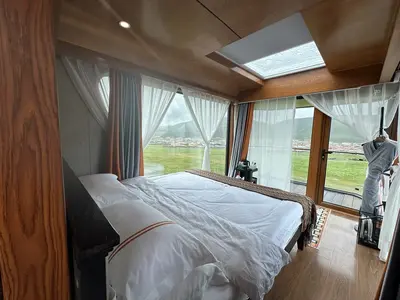 在距离黑帐篷用餐区不到一百米的地方,便是营地里的静态休息区。休息区内设置了15个太空舱,超大高清的落地窗,呈现出“陆地版游艇”的高级感。舱体内兼具智能家居的极致舒适,实现了人与自然景观的深度拥抱。